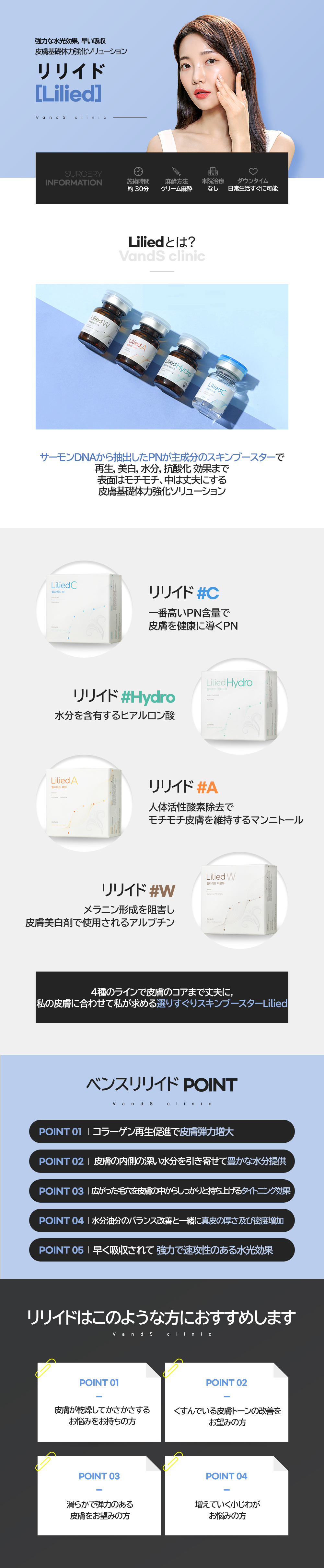 A. 従来のハイジュ水光注射は医薬品ですが、リリイドMはプレミアムヒアルロン酸ナトリウムを含む医療機器・組織修復用生体材料です。厳格な精製プロセスを経て作られた製品で、肌に即座に水分をチャージし、肌内部のコラーゲンを再生することができます。特に吸収が早く、施術後すぐに日常生活が可能です。
