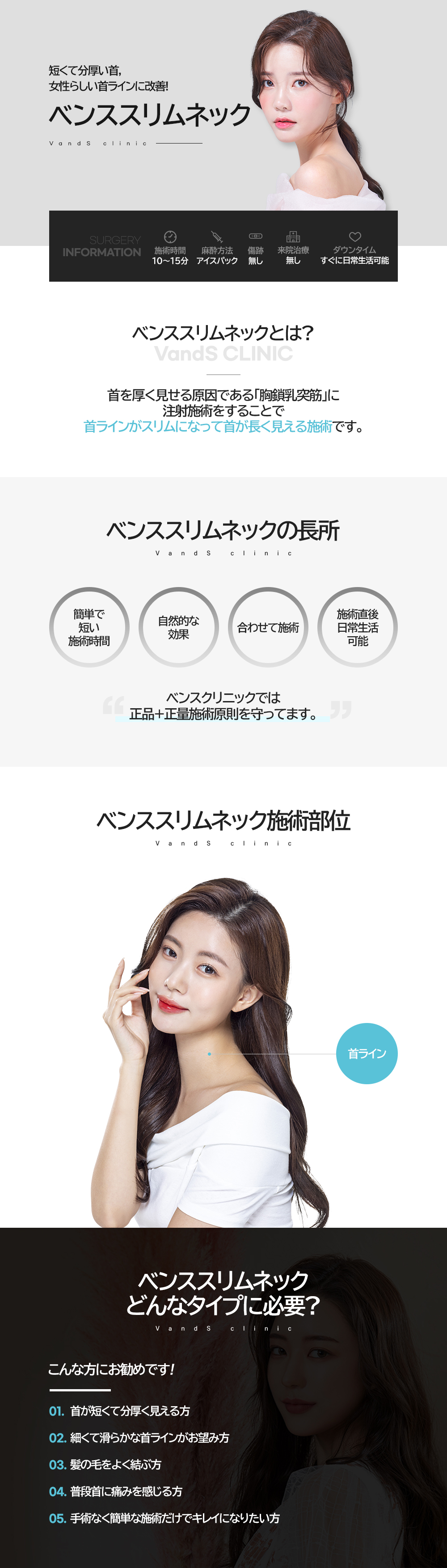 首を厚く見せる原因である首斜筋(胸鎖乳突筋)に注射施術を行い、首のラインが薄くなり、首が長く見える施術です。